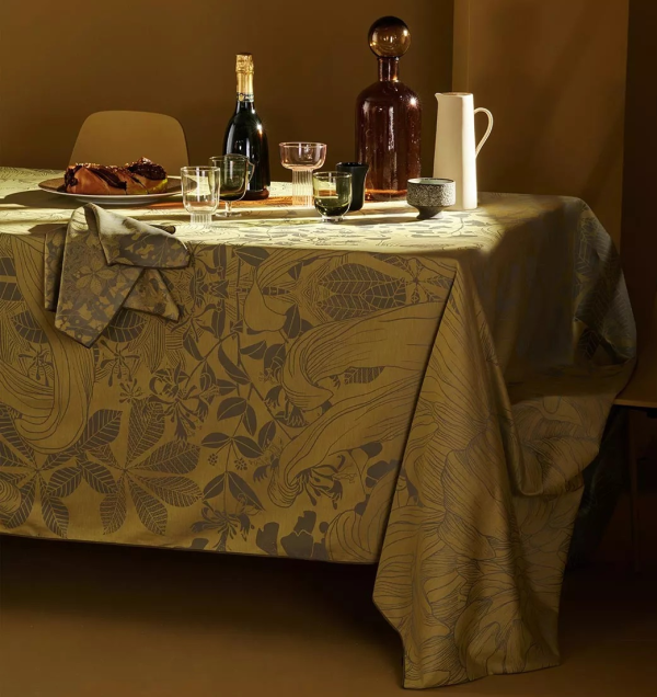 Tischserviette 60x60 cm, Natur-Khaki, 100 % feine und leichte Jacquard-Damast-Baumwolle, hohe Fadendichte. Zahlreiche Blätter in kontrastierendem Khaki. Passendes Khaki-Bourdon-Overlock-Finish.