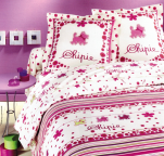 Flat bed sheet 180X290 cm and 1 pillowcase 60x64 cm 100% cotton Chipie marshmallow pink. Unbleached flat bed sheet with Chipie dogs in pink, burgundy and anise green surrounded by pink flowers and circles. Ecru pillowcase with steering wheel and reversible. Washable 60°C.