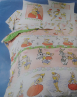 Duvet cover 140X200 + 1 pillowcase 63x63 cm nursery rhyme peaches molds 100% cotton. Reversible duvet cover with the illustrated nursery rhyme and on the other side small fish, stars and waves on a white background. Duvet cover and pillowcase framed by yellow and white edge.