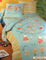 140x200 duvet cover + 1 pillow case 63x63 cm rhymes: pippin and apple api 100% cotton. Reversible Duvet Cover one side with drawings depicting the nursery rhyme with pippin and apples on a light blue background and one side white small circles on light blue background. The registration of the nursery rhyme on the duvet cover and pillowcase : "Pomme de...