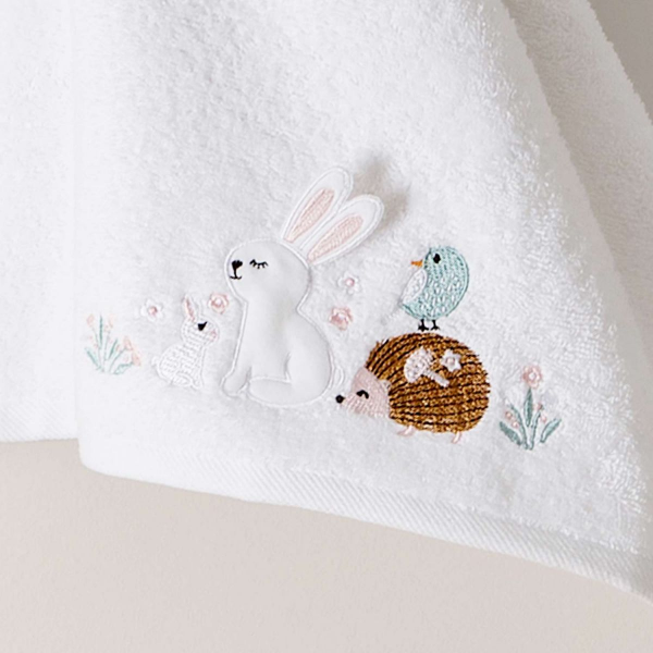 Bath cape + Towel + Bib set embroidered 100% white cotton 350g / m². Very soft, they are edged with a quality white cotton bias and embroidered with pretty little animals: rabbits, hedgehogs and birds. Mixed set for girl or boy. Bib 22 x 23,5 cm with velcro closure. Towel 50x80 cm and bath cape 79x81 cm practical for wrapping and wiping baby. A perfect idea for a baby shower gift.