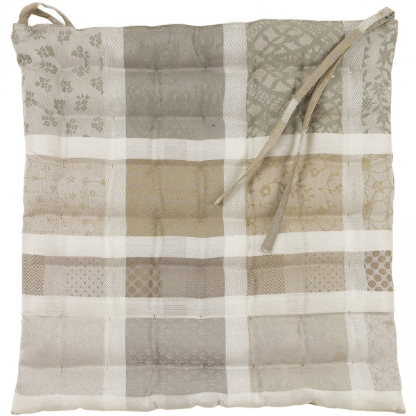 Fancy chair cushion beige tiles 38x38 cm, thickness 3 cm. Chair cushion with 1 side 100% cotton and 1 side cotton coated, spongeable. Chair cushion practical because you can arrange them according to the use (inside, outside, adult, child). Attached by 100% cotton ties. Price for 2 pieces.