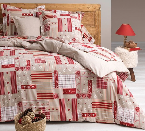 Reversible duvet cover with patchwork mountain including tiles, lines, hearts, Edelweiss flowers on a beige background, on the other side a plain beige fake, bottle finish with flap of 40 cm. Square pillowcase : mountain patchwork. Rectangular pillowcase and Bolster: uni fake beige. Duvet cover and pillowcase 100% cotton printed.