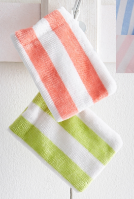 Gant de toilette enfant, 9x13 cm, 100% coton éponge jacquard velours, à rayures, 360 gr/m². Existe en couleurs : bleu et rose.