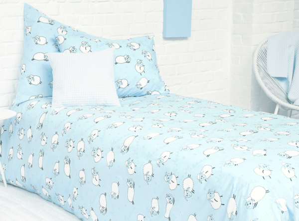 Housse de couette 140x200/220 et taie de 65x65 cm moutons bleus en 100% coton. Housse de couette réversible avec des adorables petits moutons blancs et bleus sur fond bleus. Finition forme bouteille avec rabat. Taie sac réversible assortie à la housse de couette.