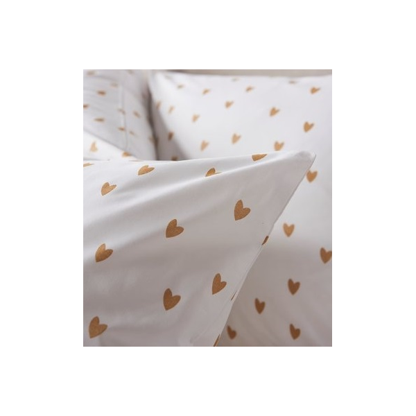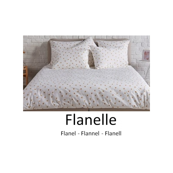 Housse de couette + taies 65x65 cm Coeurs d'or 100% coton flanelle. Housse couette réversible avec dessins de petits coeurs doré sur fond blanc. Housse couette forme bouteille avec rabat. Taie d'oreiller assortie à la housse de couette. La housse de couette 140x200 est vendue avec 1 taie. Les housses de couette 200, 240 et 260 sont vendues avec 2 taies.