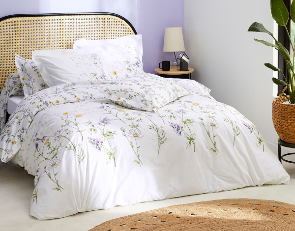 Housse de couette réversible + taie 100% coton dessin de fleurs sur fond blanc. Taie réversible volant plat 65x65 cm avec dessins de fleurs et assorti à la housse de couette.