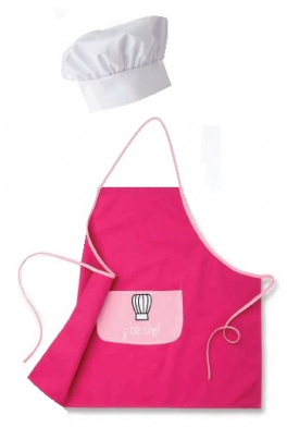 Tablier bavette rose fuschia pour enfant avec le texte "p'tite chef" et le dessin d'une toque sur la poche centrale rose clair, polyester/coton. Tablier avec ceinture tissu rose clair. Modèle spéciale pour fille. La tablier est accompagné d'une toque blanche réglable par velcro. Tablier taille unique.