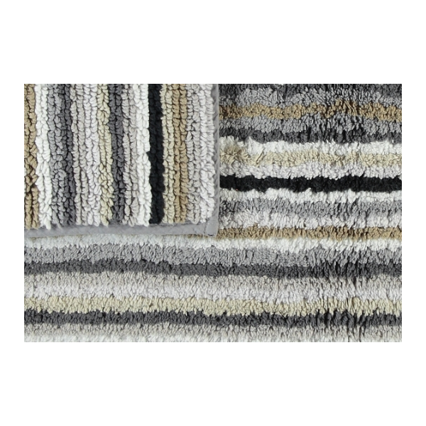Tapis de bain réversible 100% coton peigné éponge lignés multicolores, 2200 gr/m². Une face avec boucles et une face éponge avec touché velours. Couleurs : beige, lin, gris, blanc et noir. Existe en 60x60 cm et en 60x100 cm.
