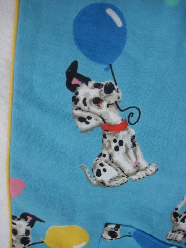 Badjas voor kinderen in 100% blauwe katoen stof en 100% katoen badstof zeer absorberend, Disney Dalmatiërs. Badjas met halslijn judo, kruissluiting, sluiting met riem vastgehouden met 2 lussen, raglanmouwen, gele randafwerking. Badjas blauwe achtergrond bezaaid met Dalmatische honden omgeven door voetafdrukken en blauwe en gele ballonnen. Gemengde kinderbadjas voor meisjes en jongens in ...